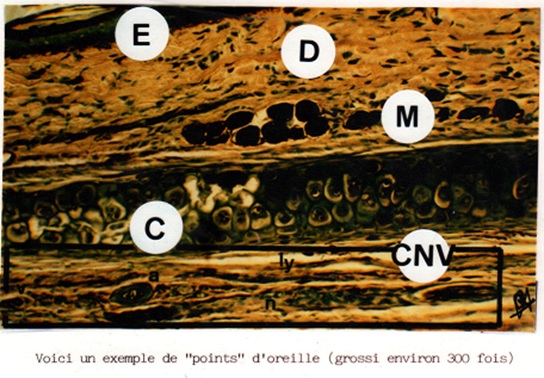 Récemment, a été publié un superbe livre du docteur Claudie Terral de Montpellier, traitant des points d’oreille et des points d’acupuncture (23). Cette chercheuse démontre l’existence physique des points d’oreille appelés aujourd’hui complexes neuro-vasculaires (CNV). Ces complexes, étudiés en histologie par le docteur Odile Auziech, semblent intervenir dans la thermorégulation du corps (24)(27). Le pavillon auriculaire serait truffé de petites « sondes » impliqués dans le contrôle de la température des organes. Ces CNV ont une taille qui varie selon les différents territoires de l’oreille (24).