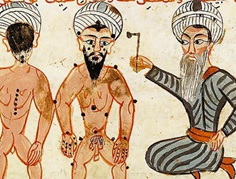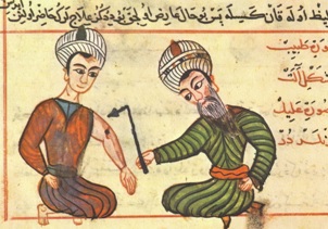 Dans la chirurgie d’Albucasis (traduction du Dr Leclerc, Paris 1861, p 41), il est précisé qu’ « on cautérisera trois fois à la hauteur de la hanche avec un cautère en forme d’olive, en disposant triangulairement les trois cautérisations. La distance entre chacune d’entre elles sera de l’épaisseur d’un doigt. De plus, on fera une cautérisation au point de l’articulation, ce qui fait quatre. Si la maladie s’étend à la cuisse et à la jambe, il faut cautériser deux fois à la cuisse sur le trajet indiqué par le malade et une fois dans une étendue de quatre doigts, au dessus du tendon d’Achille » (2).