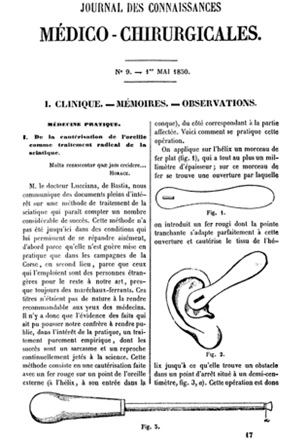 C’est une lettre du docteur Luciana, de Bastia en Corse, lettre insérée dans le Journal des Connaissances médico-chirurgicales de mai 1850 qui alerte le monde médical sur les pratiques des guérisseurs.(8) Le docteur Luciana y décrit la technique des maréchaux de Corse qui guérissent la sciatique en cautérisant avec un fer rouge un point de l’oreille externe du côté homo-latéral à la douleur. Cette publication a un grand retentissement. Le Professeur Joseph Malgaigne de Paris, étonné des résultats obtenus par les guérisseurs corses essaye de pratiquer lui-même les cautérisations à l’hôpital Saint-Louis et s’aperçoit que ce procédé est remarquablement efficace pour le traitement de la sciatique, à tel point qu’il convie ses confrères à assister aux séances de cautérisation (9). C’est ainsi que Charles-Édouard Brown-Séquard, père de la neurologie moderne et scientifique mondialement reconnu a relaté ce moyen dans une leçon faite à l’ouverture des leçons médicales, à l’Université de Harvard (USA) le 7 novembre 1866 (10) :