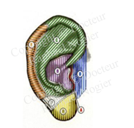 L’originalité de la démarche de Paul Nogier est de préciser qu’on peut diviser la surface de l’oreille en sept zones bien précises qui sont sensibles à sept types de fréquences différentes (19).