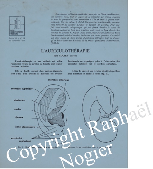 - NOGIER Paul : « L’auriculothérapie ». Lyon-Méditerranée Médical Tome VII n° 14 septembre 1971.